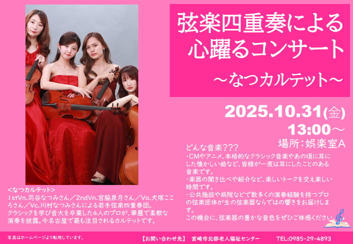 最終日は、若手弦楽四重奏団〖なつカルテット〗によるコンサートを行います。